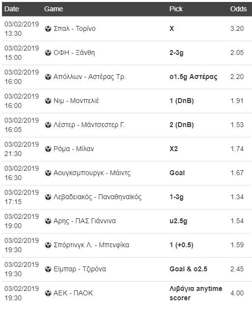 Ποικιλία στις επιλογές, ποικιλία και στις προτάσεις για τον Βαγγέλη Μπραουδάκη, που έχει να διαλέξει από ένα... φορτωμένο στοιχηματικό κουπόνι για σήμερα Κυριακή (3/2).