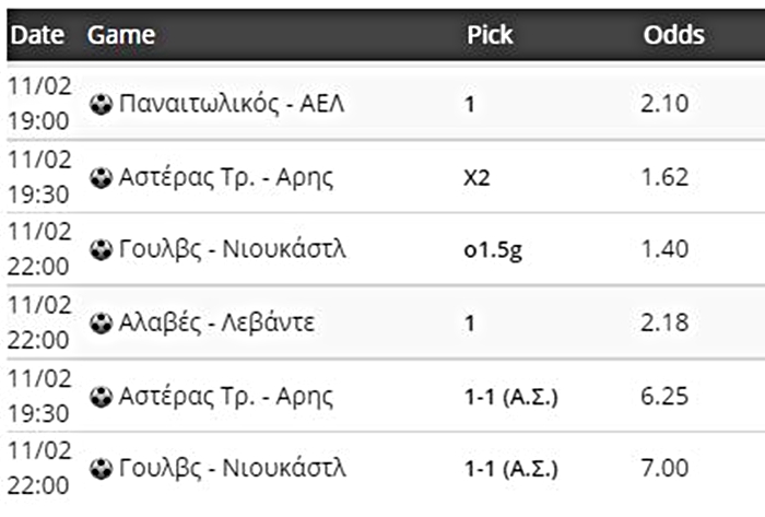 Τέλος, τα ματς στην Τρίπολη και στο Μολινό, που αναλύθηκαν παραπάνω, αξίζουν κι ένα συστηματάκι με ισοπαλίες. Εγώ θα τολμήσω λίγο παραπάνω και θα πάω σε ακριβή σκορ, στο 1-1 τους…