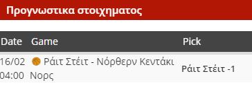 Οι Νόρθερν Κεντάκι Νορς μπαίνουν σε αυτό το παιχνίδι με ρεκόρ 20-6. Το Ράιτ Στέιτ τους υποδέχεται στο 15-11. Οριακό φαβορί η ομάδα των Ρέιντερς. Οι Ράιτ Στέιτ Ρέιντερς τρέχουν ένα σερί τριών νικών απέναντι σε IUPUI, Oakland και Detroit. Οι Νορς έχουν δείξει στα δύο τελευταία παιχνίδια να βρίσκουν το δρόμο τους αλλά δεν μπορώ να τους εμπιστευθώ. Το Ράιτ Στέιτ έχει 4-1 στα τελευταία πέντε παιχνίδια του απέναντι στο χάντικαπ και 10-4 απέναντι στα χάντικαπ στις τελευταίες 14 εντός έδρας αναμετρήσεις τους. Θα πάω με το Ράιτ Στέιτ σε αυτή την πολύ ενδιαφέρουσα αναμέτρηση.