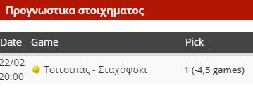 Ο Σταχόφσκι απέκλεισε τον άσημο Μπαρερέ (6/3, 6/4) την Πέμπτη. Ο Τσιτσιπάς σε μια νορμάλ ημέρα θα έχει τον απόλυτο έλεγχο. Πρόσφατα έχουμε δει τον Ουκρανό να χάνει από μέτριους παίκτες όπως οι Λεστιέν, Μπραντς, Κάμκε, Βάνι. Δεν αποκλείω ένα σετ να είναι κλειστό, π.χ. στο 7/5, όμως στο σύνολο του ματς ο Στέφανος μπορεί να καλύψει το χάντικαπ, όπως συνέβη και με τον Χούρκατς.