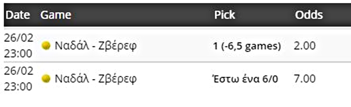 Fun bet φυσικά το 6/0, όμως υπάρχουν πιθανότητες σε τέτοια ποιοτική διαφορά. Είναι θέμα ημέρας και ψυχολογίας. Ο Ζβέρεφ δεν έχει αγωνιστικό ρυθμό και αν στην πορεία του ματς απογοητευτεί από την εξέλιξη του, τότε τίποτα δεν αποκλείεται.