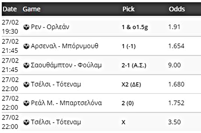 Με βάση την Άρσεναλ και ρίχνοντας ματιές στο ντέρμπι του Λονδίνου (Τσέλσι-Τότεναμ) αλλά και το Clasico πορεύεται στοιχηματικά για σήμερα (27/2) ο Βαγγέλης Μπραουδάκης.