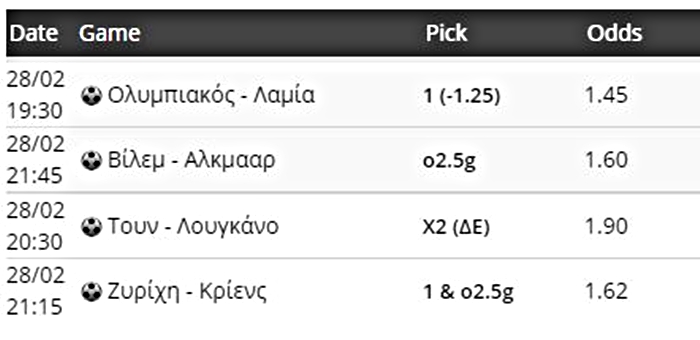 Εμπιστοσύνη στην ανωτερότητα Ολυμπιακού και Ζυρίχης δείχνει ο Βαγγέλης Μπραουδάκης στις επιλογές του από το σημερινό (28/2) κουπόνι.