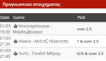 Ξεκινάμε με Γερμανία και την αναμέτρηση Ντούισμπουργκ-Μαγδεμβούργο. Οι δύο ομάδες παλεύουν για την παραμονή στην κατηγορία, με τους γηπεδούχους να είναι στην χειρότερη θέση. Οι «ζέβρες» τρέχουν αρνητικό σερί και αγνοούν τη χαρά της νίκης εδώ και ένα μήνα. Από την άλλη, το Μαγδεμβούργο βρίσκεται σε τρομερό φεγγάρι και μέσα στο ‘19 δεν έχει ήττα. Τη δεδομένη στιγμή έχει το μομέντουμ, αλλά η Ντούισμπουργκ δεν έχει περιθώρια και θα τα δώσει όλα, παρότι έχει πολλά αμυντικά κενά. Αξίζει λοιπόν το over 2.5 σε αποδόσεις διπλασιασμού.