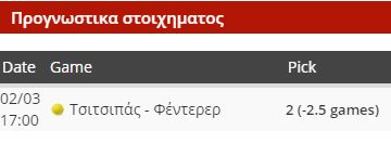 Υπάρχουν αρκετοί λόγοι για να δικαιολογηθεί το 1.40 στον Φέντερερ. Η καλή του απόδοση όλη την εβδομάδα, η μεγάλη επιθυμία για ρεβάνς, ο στόχος για τον 100ο τίτλο, η ξεκούραση ενός μήνα μετά την Αυστραλία, ταυτόχρονα η καταπόνηση του Στέφανου και οι ενοχλήσεις στην πλάτη. Τα δεδομένα δείχνουν νίκη Φέντερερ στο Ντουμπάι. Το μικρό χάντικαπ μπορεί να καλυφθεί.