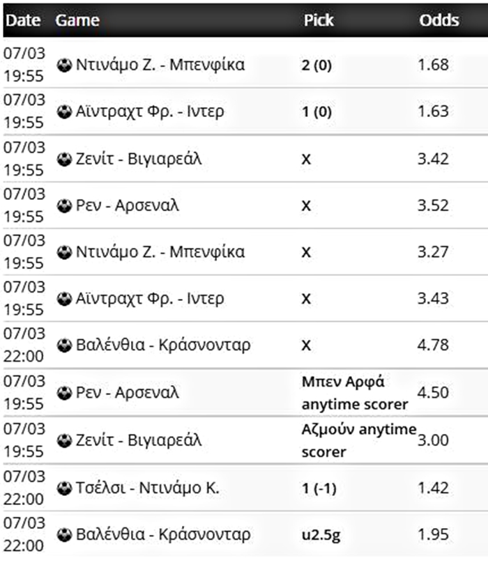 Με επιλογές από το Europa League οι σημερινές (7/3) στοιχηματικές προτάσεις του Βαγγέλη Μπραουδάκη.