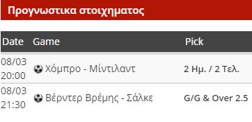 Στη Bundesliga, η Βέρντερ Βρέμης φιλοξενεί τη Σάλκε. Καμία δεν είναι στο πικ της φόρμας της, όμως η ομάδα της Βρέμης, έχει ακόμα ελπίδες για ένα ευρωπαϊκό εισιτήριο. Δεν έχει ηττηθεί για επτά αγώνες πρωταθλήματος, όμως δύο νίκες και πέντε ισοπαλίες, δεν είναι η επιθυμητή συγκομιδή. Στον αντίποδα η Σάλκε, είναι πιο κοντά στη ζώνη του υποβιβασμού και ο Τεντέσκο είναι στα «σχοινιά». Πρέπει να βγάλει αντίδραση η ομάδα του και είναι πολύ πιθανό να βρει ένα γκολ κατά τη διάρκεια του ματς. Γενικότερα, έχει καλή παράδοση τελευταία στο «Weserstadion». Με βάση το αμφίσκορο, έχει αξία το combo g/g & over 2.5, σε αποδόσεις διπλασιασμού και πάνω.