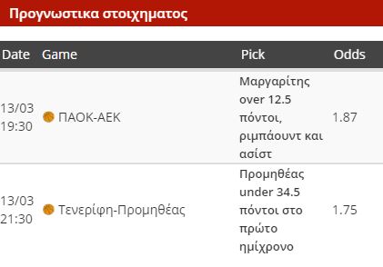 Στην Ισπανία, η Τενερίφη υποδέχεται τον Προμηθέα Πάτρας και θέλει να καλύψει το -12 της ήττας της στον πρώτο αγώνα. Για να συμβεί αυτό θα πρέπει να βασιστεί στην άμυνά της, η οποία ειδικά μέσα στην έδρα της έχει αποδειχθεί πολύ σκληρή για πιο έμπειρες και πιο ποιοτικές ομάδες από τον Προμηθέα. Πιστεύω ότι ειδικά στο πρώτο ημίχρονο, οι Ισπανοί θα βάλουν δύσκολα στην ομάδα του Μάκη Γιατρά θα δεινοπαθήσει, οπότε επιλέγω το under 34.5 πόντων στο πρώτο ημίχρονο σε απόδοση 1.75. Δεν επιλέγω το under σε ολόκληρο το ματς, επειδή μπορεί η Τενερίφη στο δεύτερο μέρος να ανοίξει τον ρυθμό και κατά συνέπεια να αυξηθούν οι επιθέσεις και για τον Προμηθέα.
