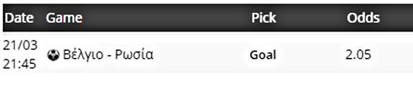 Το ματς του Βελγίου κόντρα στη Ρωσία προσεγγίζει στοιχηματικά ο Ηλίας Μαλιγιάννης από το σημερινό (21/3) κουπόνι.
