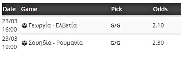Η Γεωργία υποδέχεται στη Τιφλίδα την Ελβετία, με τις δύο ομάδες να βρίσκονται στον 4ο όμιλο. Αμφότερες έκαναν εξαιρετική πορεία στο Nations League και έκοψαν πρώτες το νήμα, στα γκρουπ που βρέθηκαν. Οι γηπεδούχοι ανέβηκαν κατηγορία και η Ελβετοί άφησαν εκτός το Βέλγιο και πήραν την πρόκριση στα πλέι οφ. Σήμερα, το συγκρότημα του Πέτκοβιτς έχει τον πρώτο λόγο, αλλά η πατρίδα του Κετσπάγια δεν θα πέσει αμαχητί. Με όπλο την έδρα και τον κόσμο θα παλέψει για ένα θετικό αποτέλεσμα. Οπότε επιλέγουμε τα γκολ εκατέρωθεν που προσφέρονται σε καλή απόδοση.