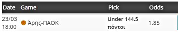Οι δύο ομάδες δεν βρίσκονται στην καλύτερη δυνατή κατάσταση, καθώς προέρχονται από άσχημες ήττες και θέλουν να επιστρέψουν τα νικηφόρα αποτελέσματα στο σημερινό ντέρμπι για να πάρουν ψυχολογία για τη συνέχεια. Κανένα από τα τέσσερα ντέρμπι που έχουν γίνει στο Αλεξάνδρειο από το 2016 και μετά δεν είχε πάνω από 140 πόντους και θεωρώ ότι κάτι ανάλογο θα δούμε και σήμερα. Επιλέγουμε, λοιπόν, το under 144.5 σε απόδοση 1.85.