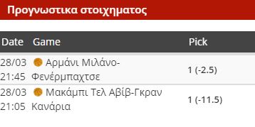 Νωρίτερα, στο Ισραήλ, η Μακάμπι που εξακολουθεί να έχει κάποιες λιγοστές ελπίδες πρόκρισης, υποδέχεται την αποκλεισμένη και αδύναμη μακριά από την έδρα της Γκραν Κανάρια. Οι Ισπανοί μετράνε επτά διαδοχικές εκτός έδρας ήττες, οι έξι εκ των οποίων είναι διψήφιες (μόνο από την Μπουντούσνοστ έχασαν με διαφορά 5 πόντων), ενώ παράλληλα έχουν μπροστά τους (σε 48 ώρες) και έναν πολύ σημαντικό αγώνα για τη σωτηρία τους στην ACB κόντρα στη Βαλένθια. Σε όλα αυτά θα πρέπει να συνυπολογίσουμε και το… απάνθρωπο ταξίδι των 5.000 χιλιομέτρων από τα Κανάρια Νησιά στο Τελ Αβίβ. Επιλέγουμε τον άσο με το χάντικαπ τω 11.5 πόντων σε απόδοση διπλασιασμού.