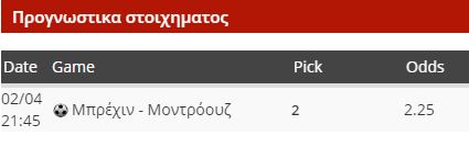 Μας την έκανε χθες η Αρσεναλ, η οποία επικράτησε μεν της Νιούκαστλ, με το τελικό 2-0 να μας «ακυρώνει» την επιλογή του άσσου και over 2.5. Πάμε σήμερα να προσπαθήσουμε να επανέλθουμε στα νικηφόρα σημεία με την επιλογή μας να έρχεται από τη Σκωτία και την εξ αναβολής αναμέτρηση της Λιγκ 1 μεταξύ της Μπρέχιν με την Μοντρόουζ.