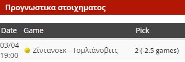 Έχει μικρό προβάδισμα νίκης η Γερμανίδα, όμως πρόκειται γενικά για δύο καλές, αλλά ασταθείς παίκτριες, οπότε θα μείνω μακριά. Από την άλλη μου έχει κεντρίσει το ενδιαφέρον ο αγώνας της Άιλα Τομλιάνοβιτς με την Ταμάρα Ζίντανσεκ, όπου το φαβορί είναι ξεκάθαρο.