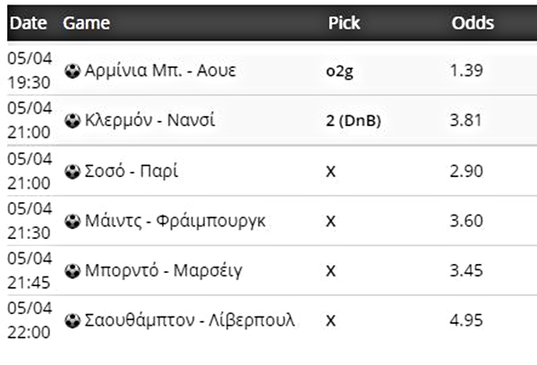 Με υψηλές αποδόσεις από Αγγλία, Γαλλία και Γερμανία κάνει... παιχνίδι ο Βαγγέλης Μπραουδάκης κοιτάζοντας το σημερινό (5/4) κουπόνι.