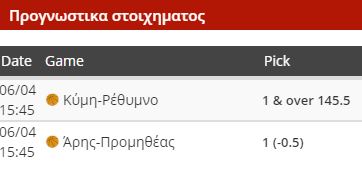 Στη Χαλκίδα διεξάγεται το σημαντικότερο, βάσει βαθμολογίας, παιχνίδι της ημέρα, καθώς Κύμη και Ρέθυμνο δίνουν έναν… τελικό παραμονής. Στην πραγματικότητα, πάντως, οι Κρητικοί είναι σε πολύ πιο δύσκολη θέση, καθώς αν χάσουν και σήμερα, οι ελπίδες για σωτηρία εξανεμίζονται. Η Κύμη έχει δείξει πολύ καλύτερη εικόνα στο φετινό πρωτάθλημα και θεωρώ ότι θα καταφέρει να πάρει τη νίκη με κύριο όπλο την επίθεση. Επιλογή μας ο άσος σε συνδυασμό με το over σε συνδυασμό με το over 145.5 σε απόδοση 2.06.