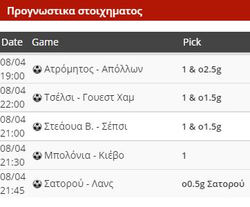 Λίγα πράγματα απόψε, ίσα για “ορεκτικό”, εν όψει του ευρωτριημέρου από αύριο. Δεν επιλέχθηκαν τα Μπριζ – Σταντάρ Λ., Τοντέλα – Πορτιμονένσε, Σπάρτα Πρ. – Ζλιν, Αμβούργο – Μαγδεμβούργο και Παλέρμο Βερόνα, οπότε απέμειναν τα εξής: