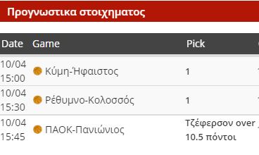 Αρχίζουμε με μια δυάδα κινήτρου, επιλέγοντας άσους σε παιχνίδια που οι γηπεδούχοι «καίγονται» για τη νίκη. Η Κύμη υποδέχεται τον πιο ποιοτικό Ήφαιστο, ο οποίος έχει εξασφαλίσει τη συμμετοχή του στα πλέι οφ και κατά πάσα πιθανότητα την 7η θέση στην κανονική περίοδο του πρωταθλήματος, αλλά δύσκολα θα μπορέσει να κοιτάξει πιο ψηλά. Η Κύμη έμπλεξε με την εντός έδρας ήττα από το Ρέθυμνο και ξέρει πολύ καλά ότι αν χάσει, είναι πιθανό να μπει στην επικίνδυνη ζώνη τρεις στροφές πριν το φινάλε. Στο Ρέθυμνο, η τοπική ομάδα υποδέχεται τον Κολοσσό και θέλει τη νίκη γιατί αλλιώς η εκτός έδρας επιτυχία της στην έδρα της Κύμης θα χάσει την αξία της. Το «Μελίνα Μερκούρη» θα έχει αρκετό κόσμο και θεωρώ ότι οι παίκτες του Βαγγέλη Ζιάγκου θα πάρουν τη νίκη. Η δυάδα μας δίνει απόδοση 2.46.