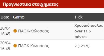 Με το ελληνικό πρωτάθλημα θα ασχοληθούμε σήμερα, καθώς διεξάγονται έξι αγώνες της 25ης αγωνιστικής της Basket League. Θυμίζω ότι έχω ποντάρει τον άσο του Ρεθύμνου από το προηγούμενο Σάββατο στο 1.80 και η τιμή του είναι πλέον 1.35. Σήμερα θα ασχοληθούμε με τον αγώνα του ΠΑΟΚ με τον Κολοσσό Ρόδου.