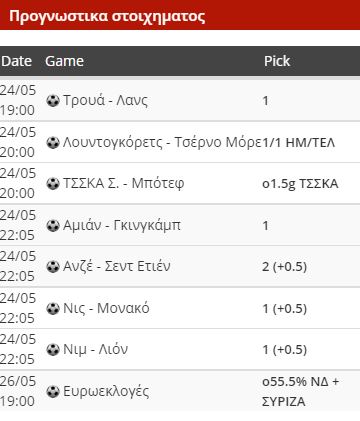 Πολύ Γαλλία απόψε, λόγω φινάλε, αλλά δεν πήρα Καέν κι ας λέει η λογική ότι ο άσος στο 1.55 είναι μπετόν. Επίσης, ολίγον από Βουλγαρία (φινάλε κι εκεί) και ένα ακόμα “μακροχρόνιο” εκλογικό…