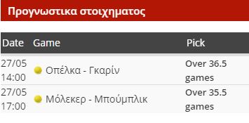 O Γκαρίν είναι εξαιρετικός στο χώμα, όμως το 1.40 δεν αντικατοπτρίζει τη δυσκολία του αγώνα. Ο Οπέλκα με ύψος 2.13 (!) σερβίρει πολύ καλά και κινείται αξιοπρεπέστατα για το μέγεθός του. Οι παίκτες που σερβίρουν από τέτοιο… υψόμετρο έχουν πλεονέκτημα στις σκληρές επιφάνειες και όχι τόσο στο χώμα, όμως είναι ματς που μπορεί να έχει εύκολα τάι μπρέικ και ο Οπέλκα μπορεί να πάρει σετ. Στο Μπούμπλικ – Μόλεκερ έχουμε το Νο 91 του κόσμου απέναντι στο 173. Οι μπουκ βλέπουν νίκη του Μόλεκερ (1.40), αλλά προσωπικά βλέπω μάχη και μίνιμουμ 4 σετ.