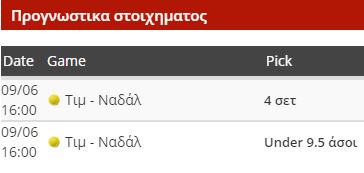 Πλέον όμως ο Τιμ έχει εξελιχθεί στο Νο 2 στην χωμάτινη επιφάνεια, ο καλύτερος σε αυτήν κάτω των 30 ετών και δικαιούται να αισιοδοξεί πως θα έχει διαφορετική εικόνα και πως θα προβληματίσει αισθητά τον αντίπαλό του. Στο 1.25 η νίκη του Ναδάλ, στο 4.40 αυτή του Τιμ. Οι αποδόσεις είναι ρεαλιστικές, μιας και ο Ισπανός θα χάσει μόνο αν ο αντίπαλός του πραγματοποιήσει επική εμφάνιση και 2η υπέρβαση μετά τη νίκη επί του Τζόκοβιτς.