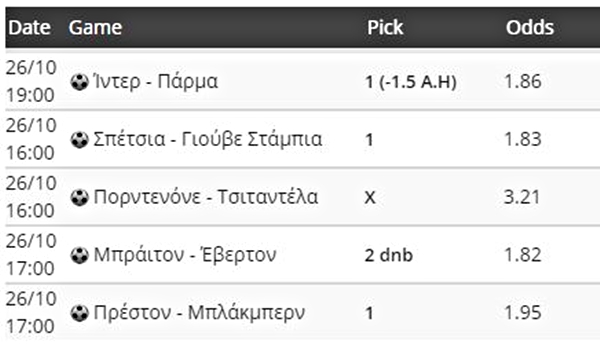 Ματς από Ιταλία και Αγγλία περιλαμβάνουν οι σημερινές (26/10) στοιχηματικές προτάσεις του Λάμπρου Λυριτζή.