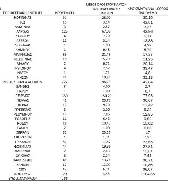 Επιπλέον, 350 κρούσματα δίνει ο Πειραιάς, 277 ο Βόρειος Τομέας Αθηνών, 274 ο Δυτικός Τομέας Αθηνών, 261 η Ανατολική Αττική, 227 ο Νότιος Τομέας Αθηνών και 149 η Δυτική Αττική.