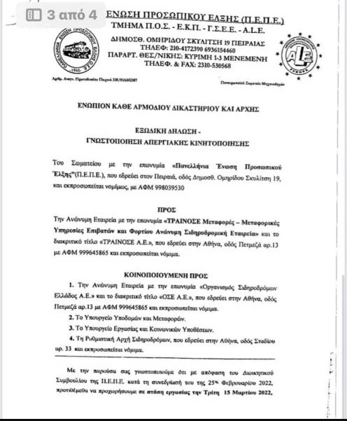 Με εξώδικό της, προς τον ΟΣΕ, το Υπουργείο Μεταφορών και Υποδομών, τη ΡΑΣ, και του υπουργείο Εργασίας, με ημερομηνία 8 Μαρτίου 2022, η Πανελλήνια Ένωση Προσωπικού Ελξης, ενημέρωνε για απεργιακή της κινητοποίηση και προειδοποιούσε για την «επαπειλούμενη διατάραξη της υγείας και της ασφάλειας των εργαζομένων, λόγω της πρωτοφανούς έλλειψης συντήρησης του δικτύου, ως απόρροια της υποχρηματοδότησης αλλά και της υποστελέχωσης του ΟΣΕ».