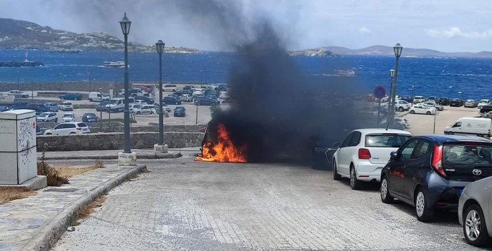 Στις φλόγες τυλίχθηκε ένα ΙΧ το μεσημέρι στο πάρκινγκ του παλιού λιμένα της Μυκόνου.