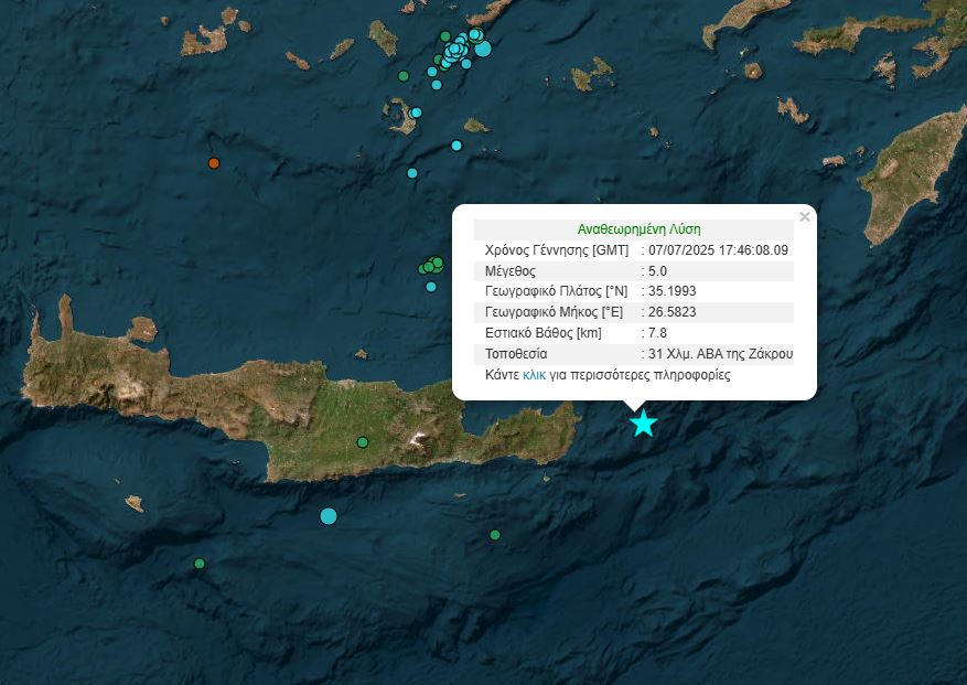 Σύμφωνα με την πρώτη εκτίμηση του Γεωδυναμικού Ινστιτούτου ο σεισμός είχε μέγεθος 5 Ρίχτερ και επίκεντρο τη θαλάσσια περιοχή 44χλμ ανατολικά της Ζάκρου στο Λασίθι.