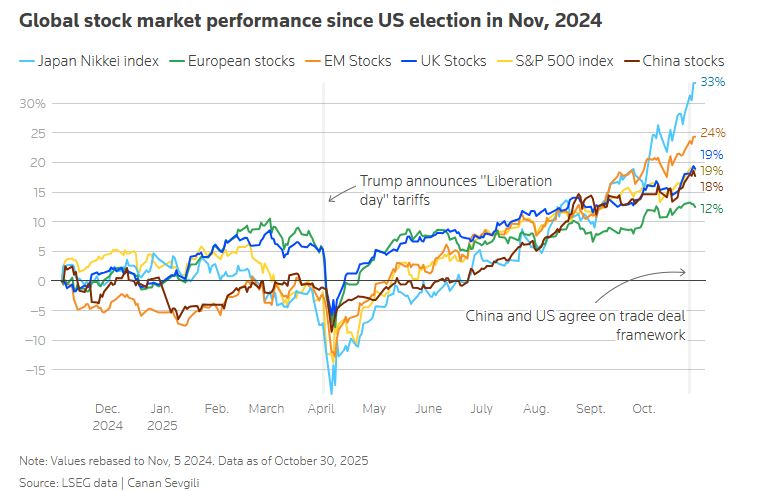 Οι χρηματιστηριακές αγορές παντού έχουν φτάσει σε ιστορικά υψηλά φέτος, παίρνοντας φόρα από τον ενθουσιασμό για την τεχνητή νοημοσύνη και την προοπτική χαμηλότερων παγκόσμιων επιτοκίων.