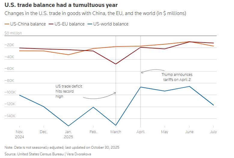 Οι δασμοί του Τραμπ έχουν αυξήσει το κόστος των επιχειρηματικών δραστηριοτήτων και έχουν κάνει τον προγραμματισμό πιο περίπλοκο. Από την άλλη, όμως, περιορίζουν το εμπορικό έλλειμμα. Τα τελευταία στοιχεία δείχνουν ότι έφτασε στο χαμηλότερο επίπεδο δύο ετών, στα 60,2 δισ. δολ. τον Ιούνιο, και το έλλειμμα με την Κίνα μειώθηκε κατά 70% σε διάστημα πέντε μηνών στο χαμηλότερο επίπεδό του εδώ και πάνω από 21 χρόνια.