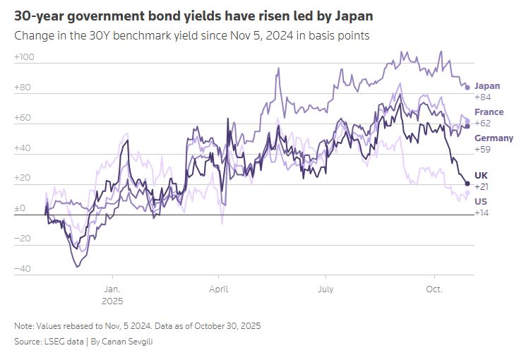 Η άνοδος των ιαπωνικών κρατικών ομολόγων ήταν πιο επιθετική, με τις αποδόσεις των 30ετών ομολόγων να έχουν αυξηθεί σχεδόν κατά 85 μονάδες βάσης σε ιστορικά υψηλά, ενώ οι αποδόσεις των γαλλικών και γερμανικών 30ετών ομολόγων έχουν αυξηθεί κατά 62 και 59 μονάδες βάσης αντίστοιχα από τις 5 Νοεμβρίου 2024.