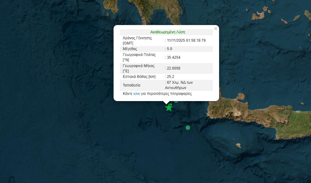 Ισχυρός σεισμός μεγέθους 5 βαθμών της κλίμακας Ρίχτερ σημειώθηκε λίγο πριν από τις 4 τα ξημερώματα της Τρίτης στη θαλάσσια περιοχή ανοιχτά των Αντικυθήρων.