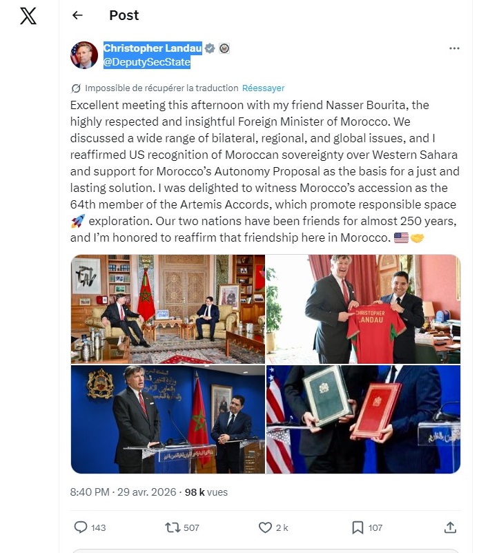 Μάλιστα, μετά την ολοκλήρωση των συναντήσεων, ανέβασε το πιο κάτω μήνυμα στον προσωπικό του λογαριασμό σε μέσο κοινωνικής δικτύωσης: «Εξαιρετική συνάντηση σήμερα το απόγευμα με τον φίλο μου Νάσερ Μπουρίτα, τον αξιότιμο και ιδιαίτερα διορατικό υπουργό Εξωτερικών του Μαρόκου. Συζητήσαμε ένα ευρύ φάσμα διμερών, περιφερειακών και διεθνών ζητημάτων και επιβεβαίωσα την αναγνώριση της μαροκινής κυριαρχίας επί της Δυτικής Σαχάρας από τις ΗΠΑ, καθώς και την υποστήριξη της χώρας μου στη μαροκινή πρόταση αυτονομίας ως βάση για μια δίκαιη και βιώσιμη λύση. Χάρηκα ιδιαίτερα που παρακολούθησα την ένταξη του Μαρόκου ως το 64ο μέλος των Συμφωνιών Artemis, οι οποίες προωθούν την υπεύθυνη εξερεύνηση του διαστήματος. Οι δύο λαοί μας είναι φίλοι εδώ και σχεδόν 250 χρόνια και είναι τιμή μου να επιβεβαιώσω αυτή τη φιλία εδώ στο Μαρόκο».