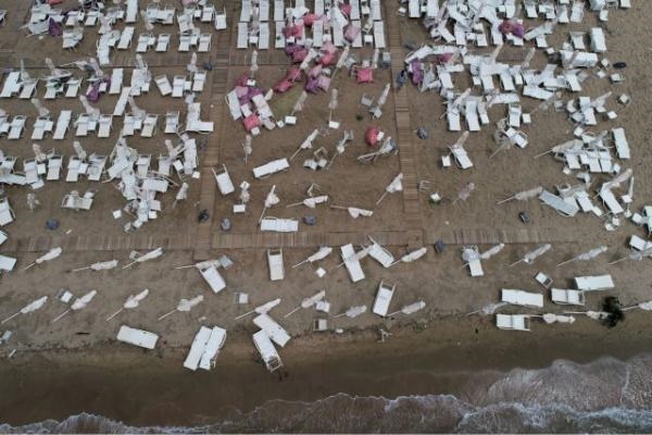 Στις εικόνες που τραβήχτηκαν από drone φαίνονται στέγες να έχουν υποχωρήσει από την μανία του ανέμου, ξαπλώστρες και ομπρέλες ανακατεμένες στην παραλία, ενώ σπίτια έχουν υποστεί ζημιές από τα ακραία καιρικά φαινόμενα που χτύπησαν την περιοχή.