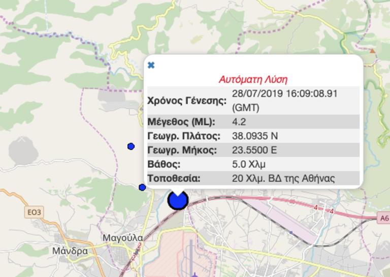 Σεισμός έγινε στις 19.09 στην Αττική. Ο σεισμός σύμφωνα με το Γεωδυναμικό Ινστιτούτο είχε ένταση 4,2 βαθμών και το επίκεντρό του ήταν 20 χιλιόμετρα βορειοδυτικά της Αθήνας. Το εστιακό βάθος ήταν 5 χιλιόμετρα σύμφωνα με τις πρώτες μετρήσεις. Ο σεισμός είχε τον ίδιο εστιακό χώρο με εκείνον της 19ης Ιουλίου, στη Μαγούλα.