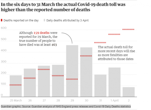 Η διαφορά είναι σημαντική επειδή με την υποτίμηση του αριθμού των θανάτων παραμορφώνουμε την καμπύλη της νόσου, γράφει ο Guardian, αναφέροντας χαρακτηριστικά ότι στις 29 Μαρτίου, αν και αναφέρθηκαν 159 θάνατοι, ο πραγματικός αριθμός των ανθρώπων που πέθαναν ήταν τουλάχιστον 463.