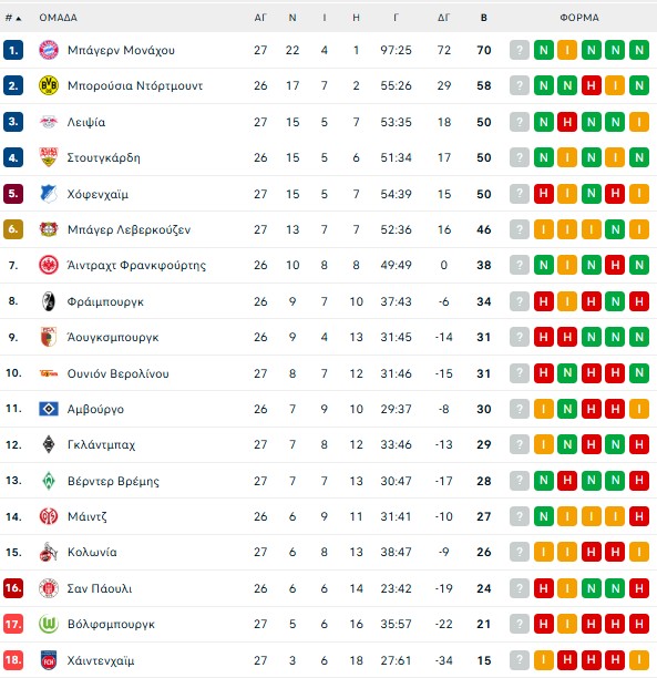 Τέσσερις αναμετρήσεις περιλάμβανε το… κυρίως πιάτο της 27ης αγωνιστικής της Bundesliga, με την Μπάγερν Μονάχου να κάνει ό,τι θέλει την Ουνιόν Βερολίνου επικρατώντας με 4-0. Ο Ολίσε άνοιξε το σκορ στο 43′, με τον Γκνάμπρι να γράφει το 2-0 στο 45’+1′. Ο Κέιν ανέβασε τον δείκτη του σκορ σε 3-0 στο 49′, με τον Γκνάμπιρ στο 67′ να διαμορφώνει το τελικό 4-0.