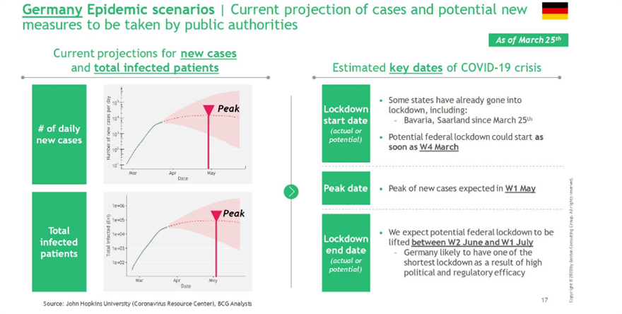 Στη Γερμανία, όπου μερικά κρατίδια όπως η Βαυαρία και το Ζάαρλαντ, έχουν επιβάλει περιορισμούς από τις 25 Μαρτίου, η κορύφωση των νέων κρουσμάτων αναμένεται την πρώτη εβδομάδα του Μαΐου και η σταδιακή άρση των περιορισμών το διάστημα ανάμεσα στην δεύτερη εβδομάδα του Ιουνίου και την πρώτη του Ιουλίου, με συνέπεια η χώρα να εφαρμόσει το πιο σύντομο διάστημα περιορισμών λόγω της εξαιρετικής αποτελεσματικότητας της.