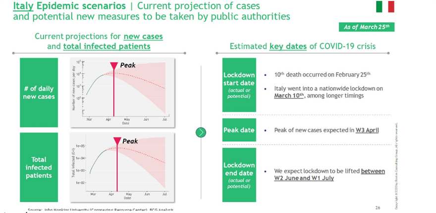 Η Ιταλία, η χώρα που βρέθηκε στην καρδιά της πανδημίας στην Ευρώπη, αναμένεται να καταγράψει την κορύφωση των νέων κρουσμάτων την τρίτη εβδομάδα του Απριλίου και να ξεκινήσει τη σταδιακή άρση των περιορισμών στις μετακινήσεις και τις συναθροίσεις το διάστημα ανάμεσα στη δεύτερη εβδομάδα του Ιουνίου και την πρώτη εβδομάδα του Ιουλίου.