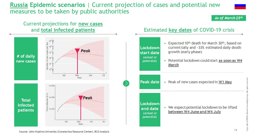 Στη Ρωσία η κορύφωση των νέων κρουσμάτων αναμένεται να καταγραφεί την πρώτη εβδομάδα του Μαΐου και η άρση των περιορισμών την τέταρτη εβδομάδα του Ιουνίου μέχρι την τέταρτη εβδομάδα του Ιουλίου.