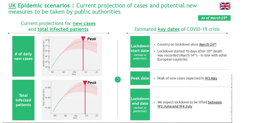 Αναφορικά με το Ηνωμένο Βασίλειο, τα σενάρια υποστηρίζουν ότι η χώρα που επέβαλε περιορισμούς δέκα ημέρες μετά τον δέκατο καταγεγραμμένο θάνατο, η κορύφωση των νέων κρουσμάτων αναμένεται την τρίτη εβδομάδα του Μαΐου, ενώ η σταδιακή άρση των περιορισμών θα ξεκινήσει την τρίτη εβδομάδα του Ιουνίου και θα ολοκληρωθεί την τέταρτη εβδομάδα του Ιουλίου.