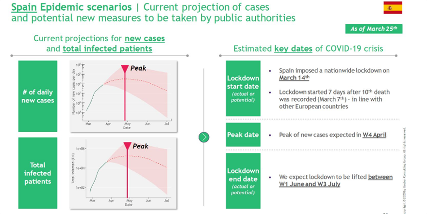 Η Ισπανία που επέβαλε περιορισμούς στις 14 Μαρτίου, η κορύφωση των νέων κρουσμάτων αναμένεται την τέταρτη εβδομάδα του Απριλίου και σταδιακή άρση του lock down το διάστημα ανάμεσα στην πρώτη εβδομάδα του Ιουνίου και την τρίτη του Ιουλίου.