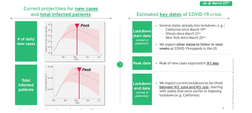 Σύμφωνα με τις εκτιμήσεις της, οι οποίες αναλύουν δεδομένα της 25ης Μαρτίου, η αμερικανική εταιρεία, υποστηρίζει ότι στις ΗΠΑ, όπου τουλάχιστον τρεις πολιτείες έχουν επιβάλει αυστηρούς περιορισμούς και άλλες θα ακολουθήσουν το παράδειγμά τους, η κορύφωση των κρουσμάτων αναμένεται την πρώτη εβδομάδα του Μαΐου, ενώ σταδιακά τα μέτρα περιορισμού θα αίρονται το χρονικό διάστημα ανάμεσα στη δεύτερη εβδομάδα του Ιουνίου και την τρίτη εβδομάδα του Ιουλίου με τις πολιτείες που επέβαλαν περιορισμούς νωρίτερα, όπως η Καλιφόρνια, να ξεκινούν να εφαρμόζουν πρώτες την άρση τους.