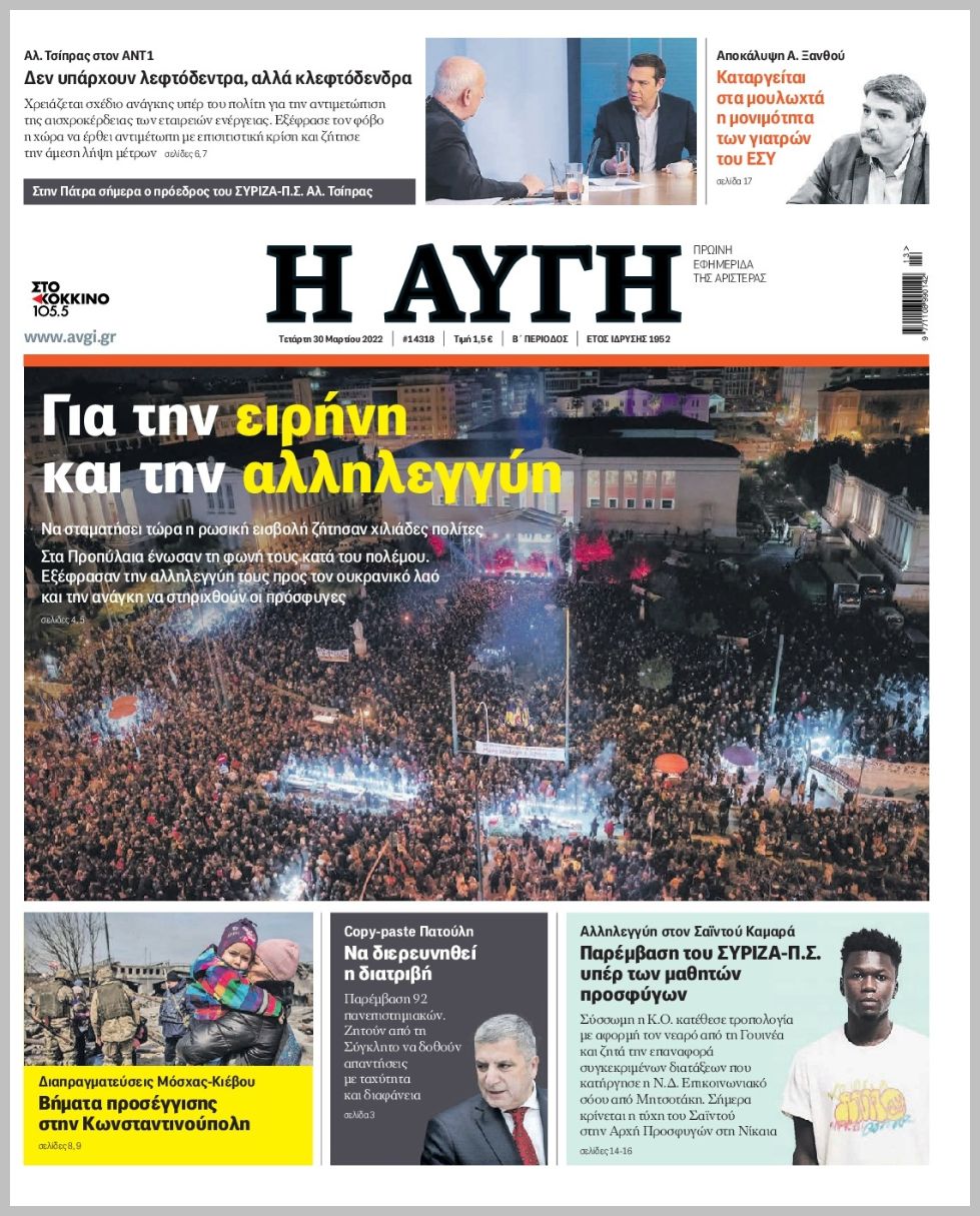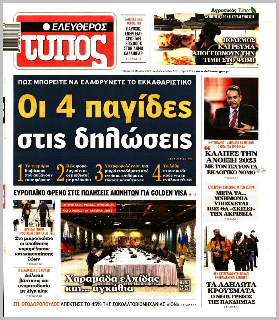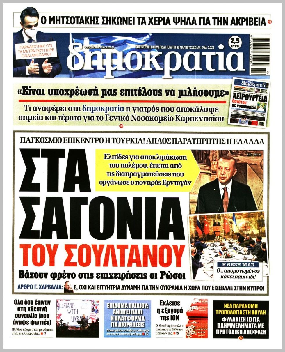 Τα πολιτικά πρωτοσέλιδα σήμερα (30/3)