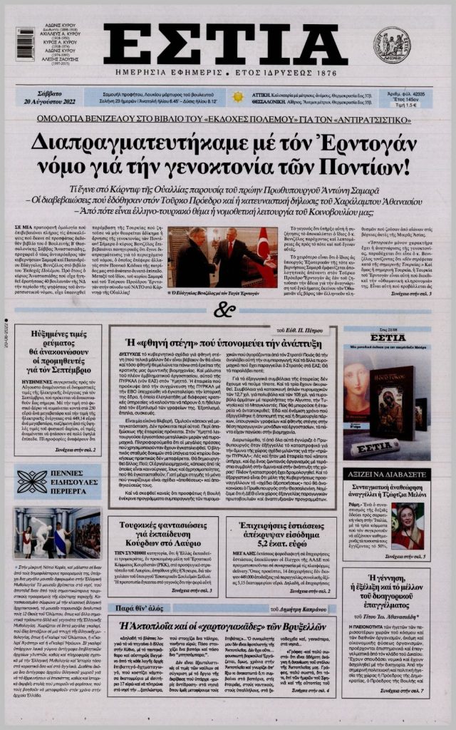 Τα πολιτικά πρωτοσέλιδα σήμερα (20/8)