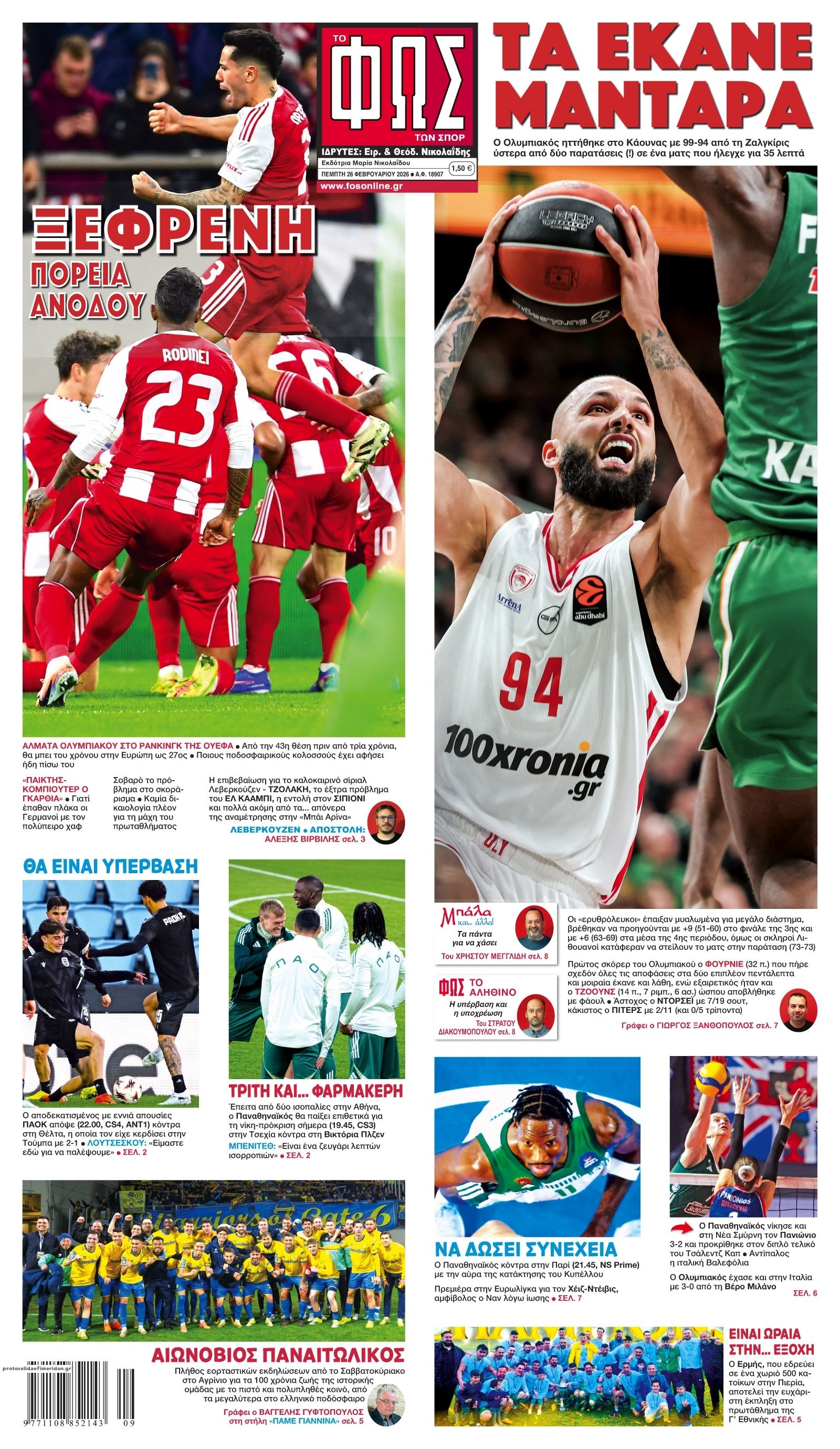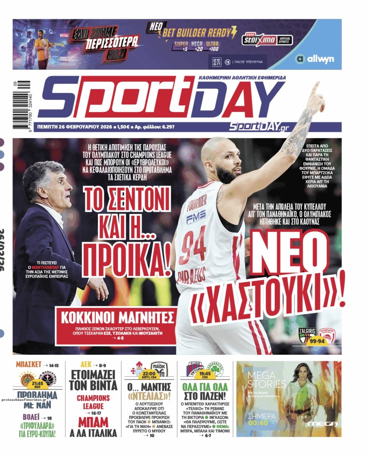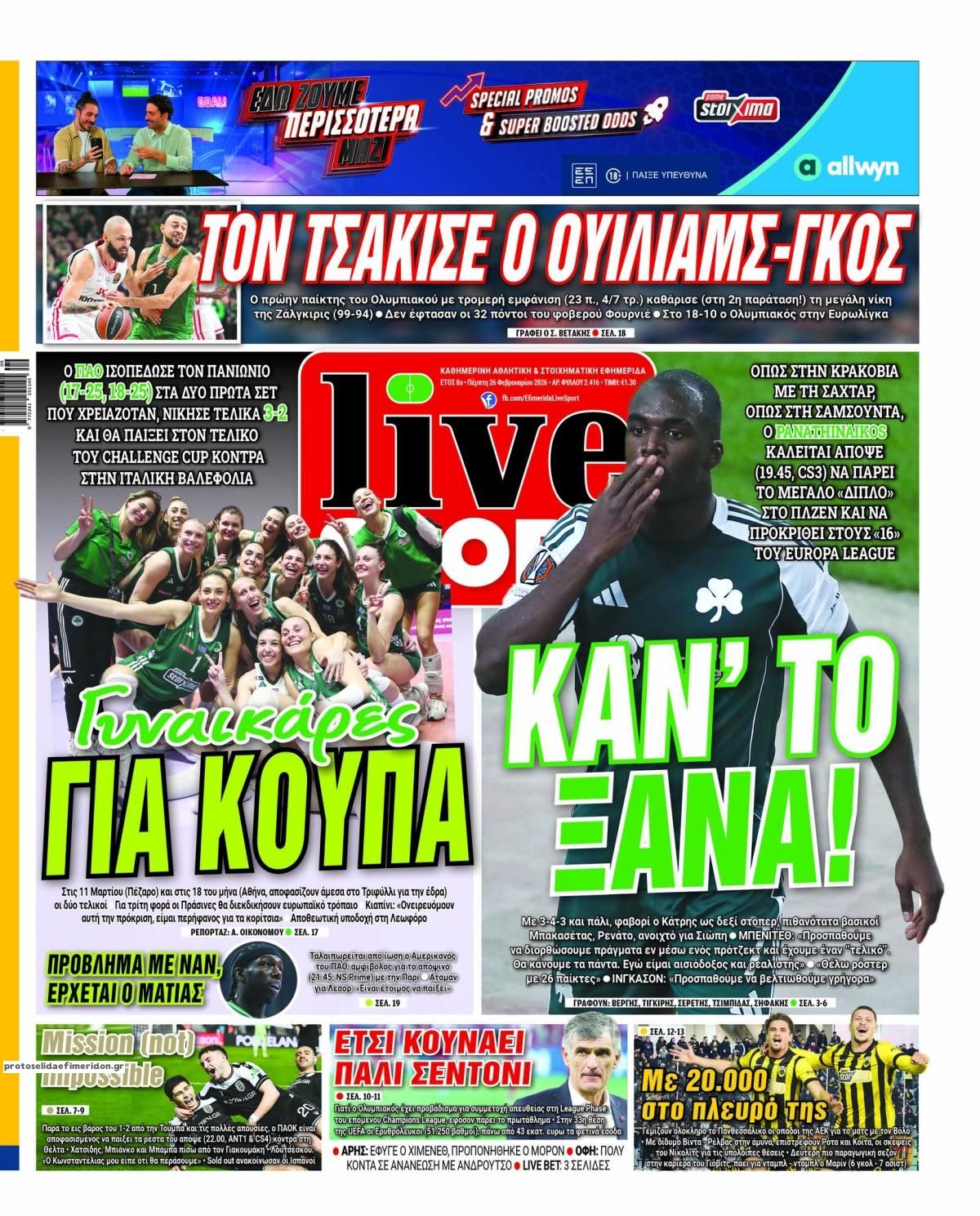 26/02/2026 08:39 Οι αθλητικές μεταδόσεις της ημέρας (26/2): Πού θα δείτε τις ευρωπαϊκές «μάχες» των Παναθηναϊκού και ΠΑΟΚ
