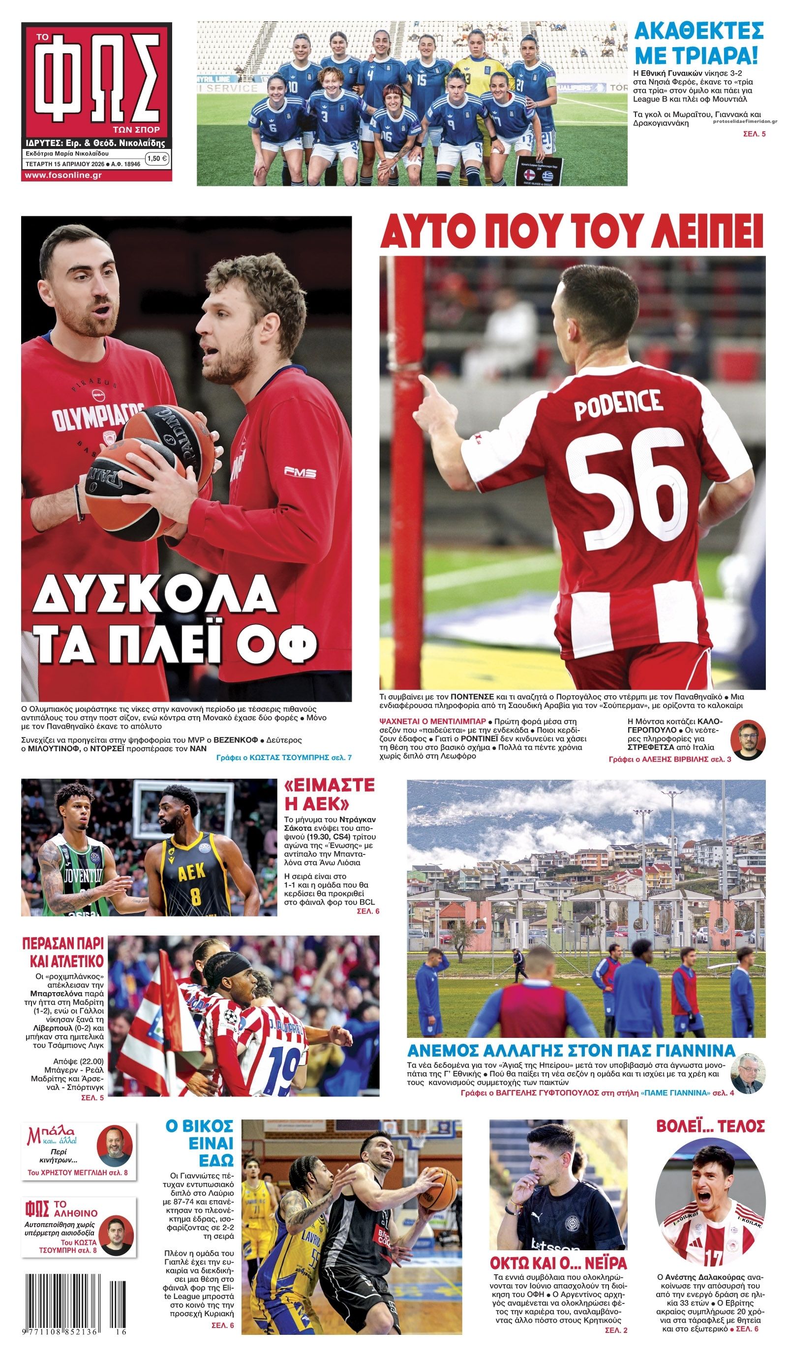 Τα αθλητικά πρωτοσέλιδα της ημέρας (15/4)